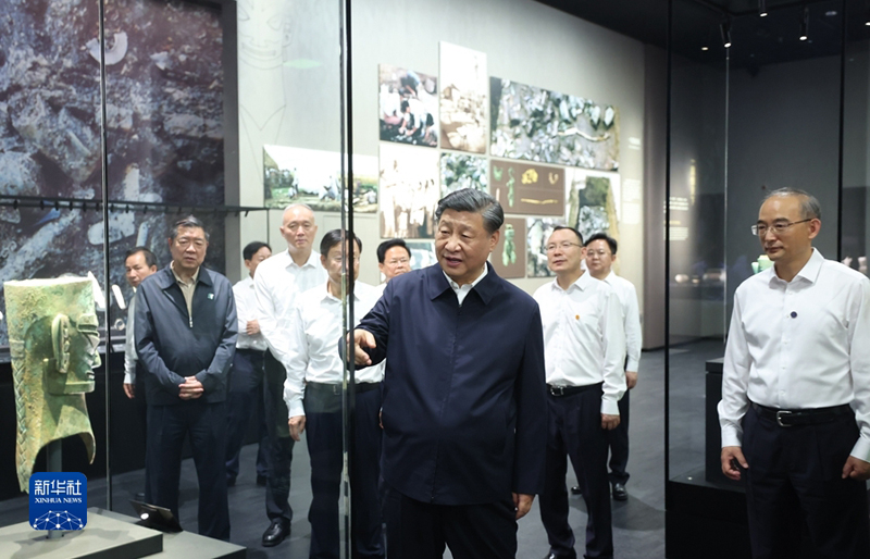 7月25日至27日,中共中央总书记、国家主席、中央军委主席习近平在四川考察。这是26日下午,习近平在位于德阳市广汉市的三星堆博物馆新馆参观。(新华社记者 鞠鹏/摄)