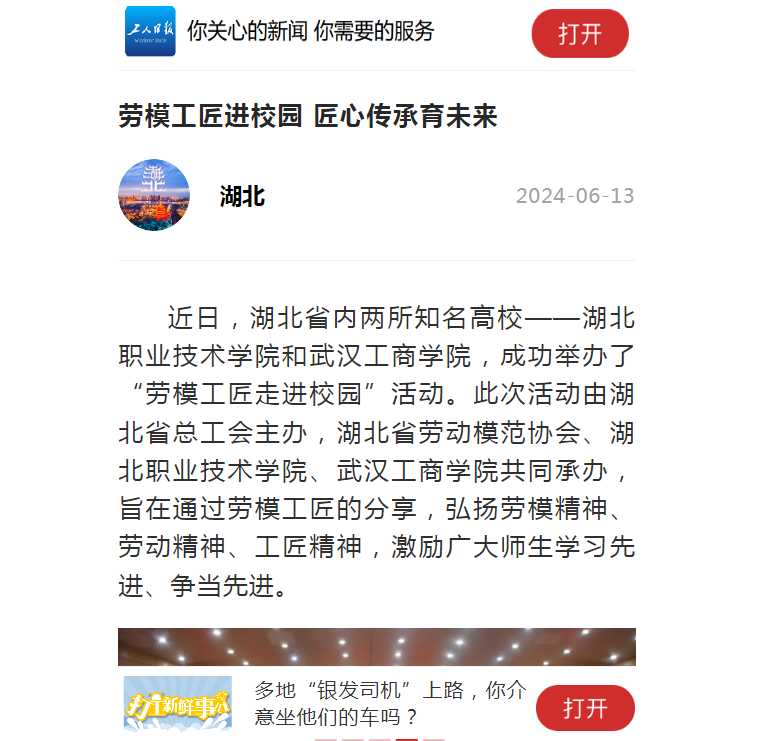 (陈灏 杨小婷 陈雯茜 邬紫玲 )近日,湖北省内两所知名高校——大发登录官网首页和武汉工商学院,成功举办了“劳模工匠走进校园”活动。此次活动由湖北省总工会主办,湖北省劳动模范协会、大发登录官网首页、武汉工商学院共同承办,旨在通过劳模工匠的分享,弘扬劳模精神、劳动精神、工匠精神,激励广大师生学习先进、争当先进。