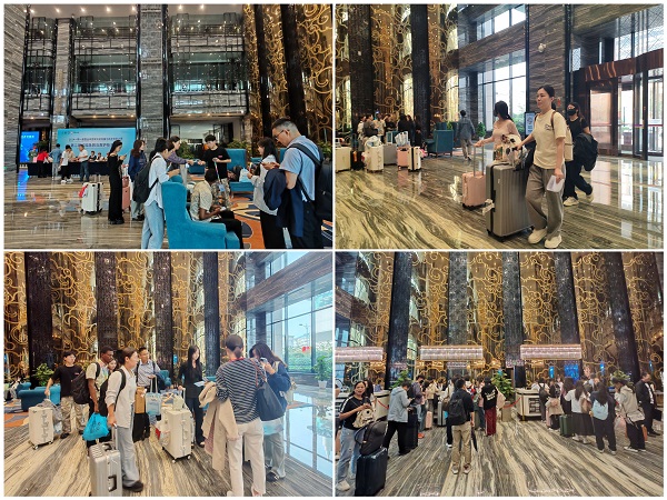在乾坤国际大酒店赛事报到登记处,大赛的志愿者们,成为一道亮丽的风景线,她们以饱满的热情,为远道而来的参赛选手和嘉宾提供热忱服务——从指引路线、搬运行李,到解答疑问、介绍校园,每一个细节都彰显着细致入微的关怀。酒店环境整洁舒适,选手们在紧张的备赛之余也能感受到家的温暖与便利。