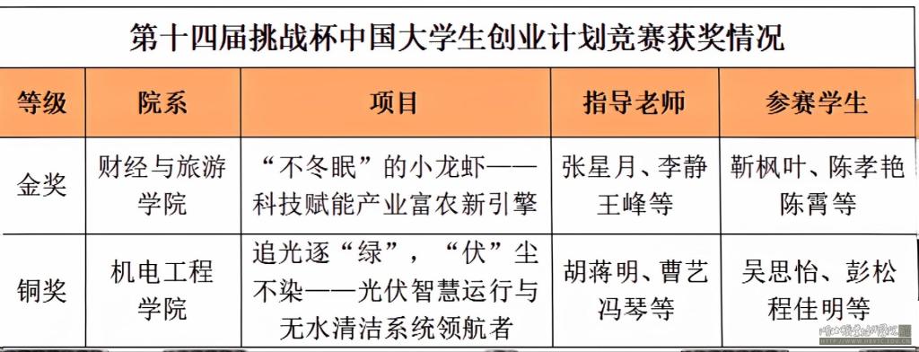 (本网讯 张星月 卢雅雪)11月2日,第十四届“挑战杯”中国大学生创业计划竞赛终审决赛圆满落幕,共青团中央书记处第一书记阿东出席闭幕会并发表重要讲话。我校在激烈的角逐中荣获1金1铜,实现在该项赛事中最高奖项和获奖数量的历史性突破!与清北复交同台竞技,全国共决出金奖180个,其中湖北省6所高校获金奖8个,我校是唯一获奖的职业院校。