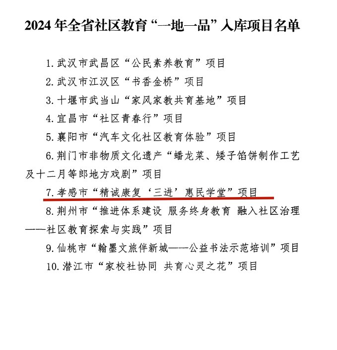 (本网讯 万飞)近日,湖北省社区教育指导中心公布了2024年全省社区教育“一地一品”项目入库名单,“精诚康复‘三进’惠民学堂”项目成功入选。