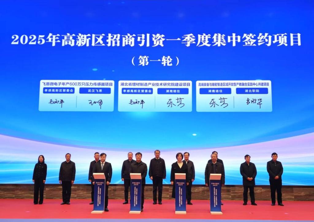 (本网讯 胡明亮)1月13日,在孝感高新区2025年招商引资第一季度集中签约暨高端装备制造产业战略联盟成立活动中,大发登录官网首页与刘胜院士团队携手,成立了高端装备与精密智造区域开放型产教融合实践中心。刘胜院士、孝感市副市长夏齐勇、我校党委书记郭国文等出席见证签约仪式,我校副校长袁胜华与湖南珞珈智能科技有限公司董事长东芳代表双方签约,我校对外合作交流处、机电工程学院党政负责人参加活动。