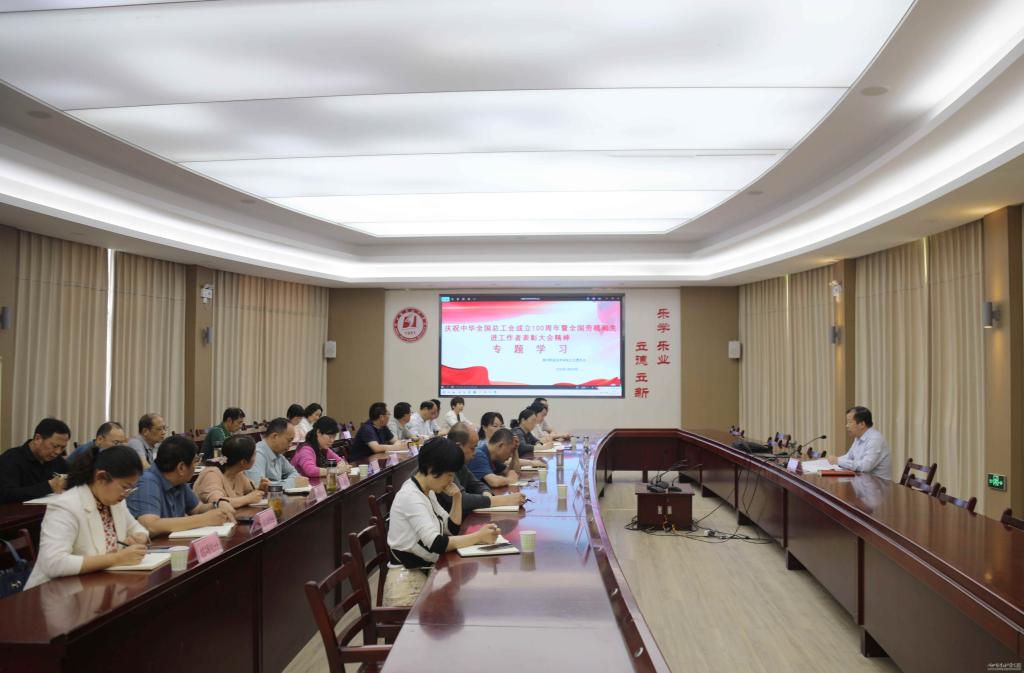 (本网讯 余斌清白胜舟黄璐)聚焦工运历史,传承红色精神。为深入学习贯彻庆祝中华全国总工会成立100周年暨全国劳模和先进工作者表彰大会精神,4月29日下午,学校工会委员会在西区文德楼201会议室组织专题学习,学校第四届工会委员会委员、全体分工会主席参加会议。学校党委副书记、工会主席王益贤主持专题学习。
