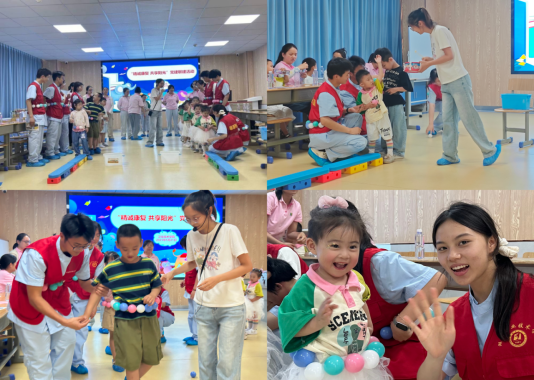 在残健融合游戏"小兔运球""球球大作战"中,学生志愿者与特殊儿童随机组队,通过眼神交流、肢体协作完成任务。听力障碍儿童小乐在成功运球后,兴奋地在志愿者手心写下"一起赢"三个字,成为"奉献、友爱、互助、进步"志愿精神的最佳注脚。这些充满趣味的互动场景,让"平等共享"的理念在欢声笑语中自然传递,化作青年学生践行社会主义核心价值观的生动实践。