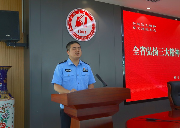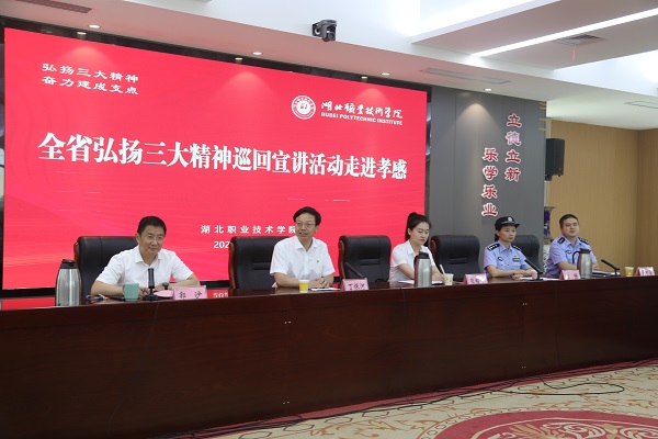 (本网讯 陈灏 喻琳)6月26日下午,全省弘扬三大精神巡回宣讲活动在我校南区图新楼举行。省委讲师团副主任张鹏、省委讲师团理论辅导处二级调研员史明、省委讲师团办公室三级调研员姚官华等出席活动;红安县职教中心教师熊樱子、武汉铁路公安局襄阳公安处应城站派出所副所长江珊、武汉市公安局江汉区分局法制大队教导员涂可蔼上台宣讲,将弘扬三大精神化作一幕幕动人心弦的鲜活故事;湖北工业大学马克思主义学院院长、教授丁银河进行了理论宣讲。我校党委副书记、校长郭沙主持宣讲活动。