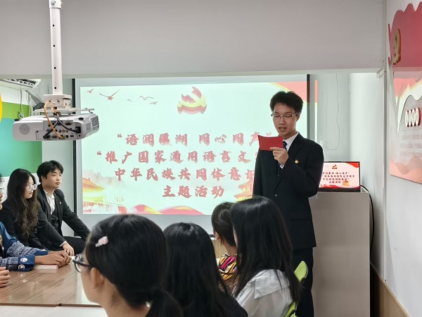 (本网讯 陈灏 许飞)在第28届全国推广普通话宣传周(以下简称推普周)来临之际,9月13日下午,“语润疆湖 同心同声——“推广国家通用语言文字铸牢中华民族共同体意识”主题活动在东区一站式学生社区举行,我校“铸牢中华民族共同体意识”宣讲员、推普志愿者、直播员(直播带货创业者)等师生代表齐聚一堂,讲述自己与普通话的精彩故事,多维度展现普通话对自己全面发展和经济社会发展的助力作用,创设使用普通话的鲜活场景,乐享语言之美,分享推普心得,共筑复兴梦想,凝聚团结力量。