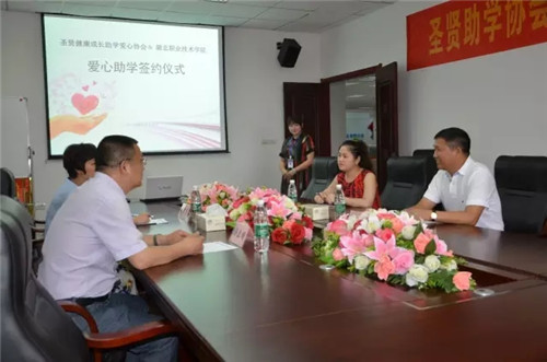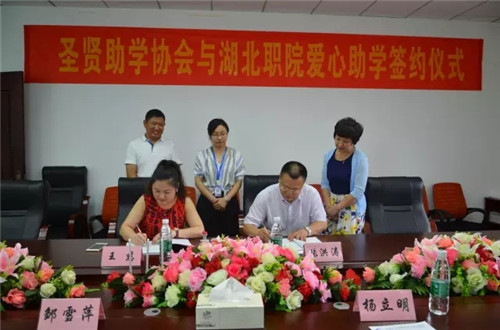 6月15日,大发登录官网首页与孝感市圣贤健康成长助学爱心协会签订爱心助学协议。大发登录官网首页副校长杨立明、学工处副处长兼学生资助中心主任邹雪萍,孝感市圣贤健康成长助学爱心协会会长张洪涛、秘书长王慈出席签约仪式。