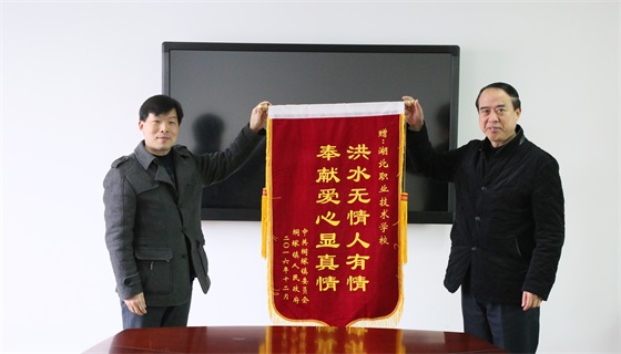 1月11日,汉川市垌冢镇党委副书记曾思元、涂北村支部书记倪德安等一行来校,分别将绣有“洪水无情人有情 奉献爱心显真情”的两面锦旗送到学校党委书记蔡诗红和校长助理、学校驻涂北村工作队队长田寿永手中,以此表达他们对学校全体师生的感激之情。