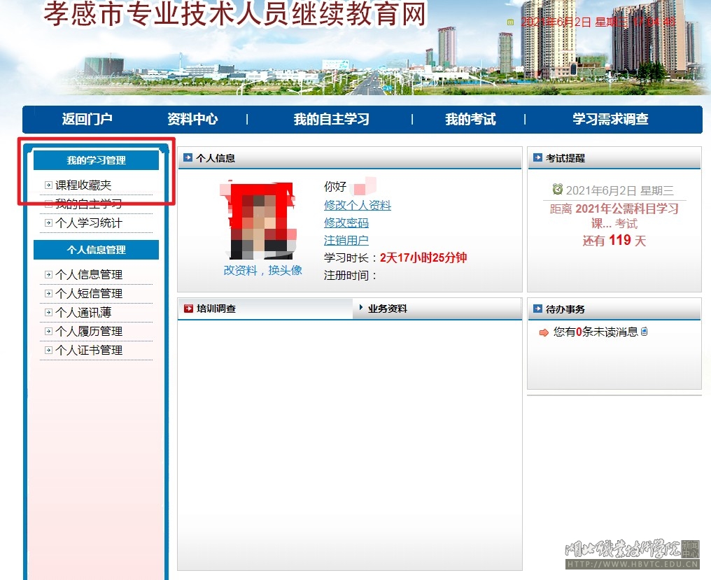 在“个人中心信息管理”中,点击“个人学习统计”,即可查询已学学时。