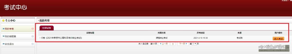 点击导航栏“我的考试”,进入考试中心,点击“进入考试”即可开始考试。