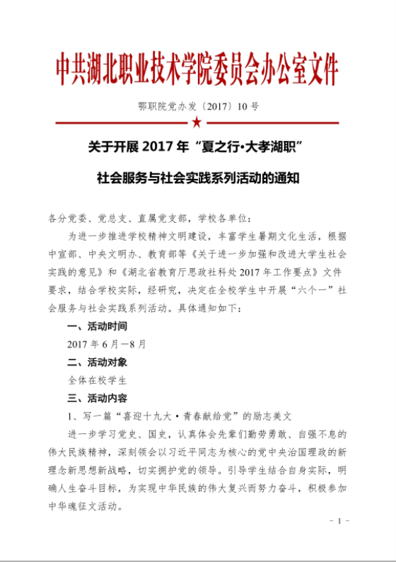 关于开展2017年“夏之行•大孝湖职”社会服务与社会实践系列活动的通知