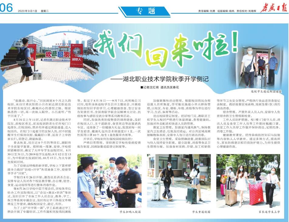 暑去秋来,经历近8个月的等待后,湖职终于全面复学复课。按照统一部署、安排,学校按照错峰原则,确定了大中专学生返校时间。8月30日至31日,为2019级学生返校;9月12日至13日,为中职新生报到时间;10月15日,为大专新生报到时间。