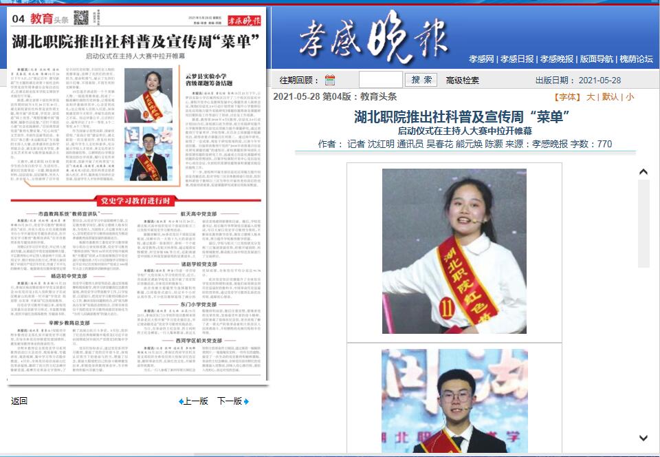 作为国家示范性高职、国家优质校、“双高计划”建设单位,湖北职院一直注重宣传、普及社科知识,提升学生人文社科素养,充分展示学校人才培养、孝文化传承方面的资源优势。以鲜明的办学理念和突出的办学成果,履行文化传承的职责,创新开展了社科普及“五送”(送政策、送教育、送服务、送健康、送文化)活动,组织科普志愿者深入社区、乡村,服务地方经济社会发展,促进学生人才培养质量提高。