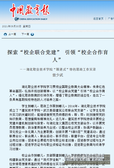 学生到哪儿,思政工作跟到哪儿。2014年,大发登录官网首页成立了“建筑技术学院—武汉泰森建筑公司联合党支部”,让学生在校外实习的关键时段,能继续接受党员师傅的传、帮、带,时刻接受党的知识教育、思想熏陶和精神洗礼。近几年,建筑技术学院持续开展校企党建共建机制创新与探索,与湖北信义集团公司党支部合作,以开展党员思想教育、政治素质培养为主线,以整合校企资源、协调产教融合、深化校企一体化育人为主要职责,创新开展“5联5促”党建活动,通过联席会议、联合育人、联合活动、联手项目、联建平台,促进专业与职业岗位对接、促进专业课程内容与职业标准对接、促进教学过程与生产过程对接、促进学历证书与职业资格证书对接、促进职业教育与终身学习对接。