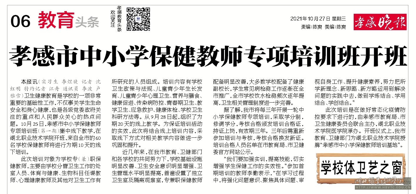 本报讯(实习生 李煜婕 记者 沈红明 特约记者 江舟 通讯员 李波 卢雅雪)卫生健康教育是学校的一项非常重要的基础性工作,不仅事关学生生命安全和身心健康,也是各级党委政府关注的重点和人民群众关心的热点问题。10月25日,孝感市中小学保健教师专项培训班(第一期)集中线下教学,在大发登录官网首页开班,来自全市的60名学校保健教师将进行为期 10 天的线下培训。