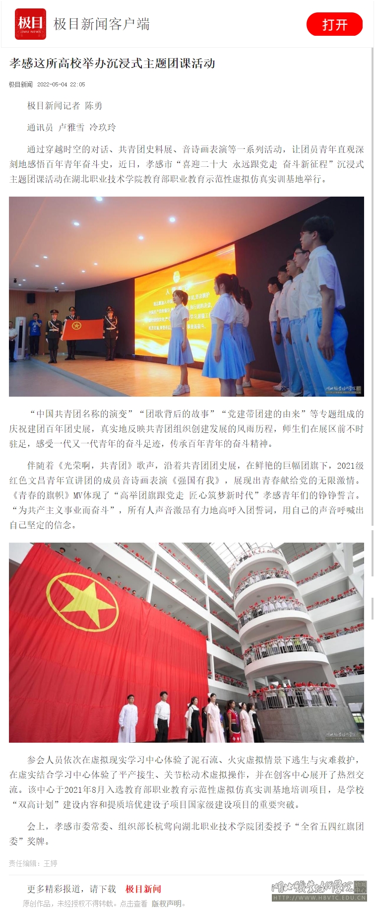 通过穿越时空的对话、共青团史料展、音诗画表演等一系列活动,让团员青年直观深刻地感悟百年青年奋斗史,近日,孝感市“喜迎二十大 永远跟党走 奋斗新征程”沉浸式主题团课活动在大发登录官网首页教育部职业教育示范性虚拟仿真实训基地举行。