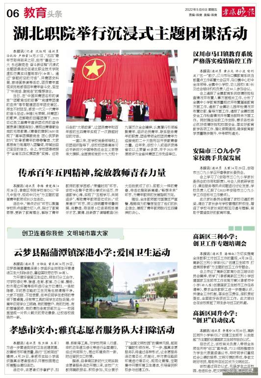 当日,在“中国共青团名称的演变”“团歌背后的故事”“党建带团建的由来”等专题建团百年团史展区,师生不时驻足,感受一代又一代青年的奋斗足迹;伴随《光荣啊,共青团》的歌声,在鲜艳的巨幅团旗下,2021级红色文昌青年宣讲团成员的音诗画表演《强国有我》,展现出青春献给党的无限激情;《青春的旗帜》MV体现了“高举团旗跟党走 匠心筑梦新时代”的孝感青年的铮铮誓言,大家激昂有力地高呼入团誓词,呼喊出自己坚定的信念。会上,学校团委被授予“全省五四红旗团委”奖牌。这场行走的“大思政课”,让团员青年和百年前的五四青年实现了一次跨越时空的对话。