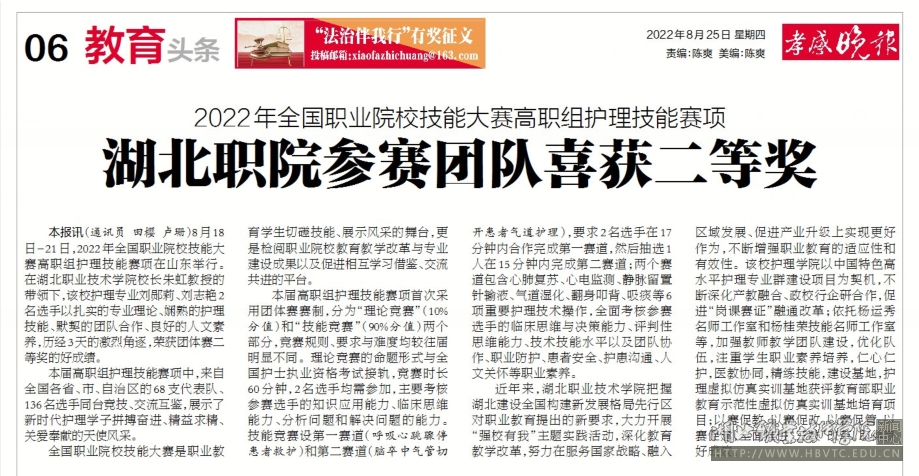 8月18日至21日,2022年全国职业院校技能大赛高职组护理技能赛项在山东举行,来自全国各省市自治区的68支代表队、136名选手同台竞技、交流互鉴,展示了新时代护理学子拼搏奋进、精益求精、关爱奉献的天使风采,赛出了水平,赛出了风格,赛出了和谐。在校长朱虹教授的带领下,护理专业刘郧莉、刘志艳2名选手以扎实的专业理论、娴熟的护理技能、默契的团队合作、良好的人文素养,历经3天激烈角逐,荣获团体赛二等奖的好成绩。