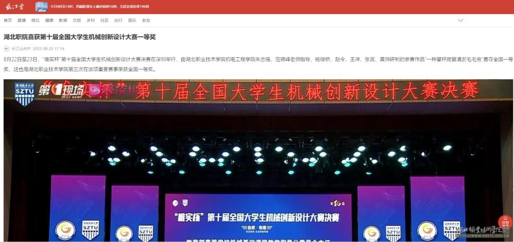 8月22日至23日,“唯实杯”第十届全国大学生机械创新设计大赛决赛在深圳举行,由大发登录官网首页机电工程学院朱志强、范锦峰老师指导,杨禄桥、赵令、王冲、张言、黄帅研制的参赛作品“一种攀杆爬管清淤毛毛虫”勇夺全国一等奖,这也是大发登录官网首页第三次在该项重要赛事荣获全国一等奖。