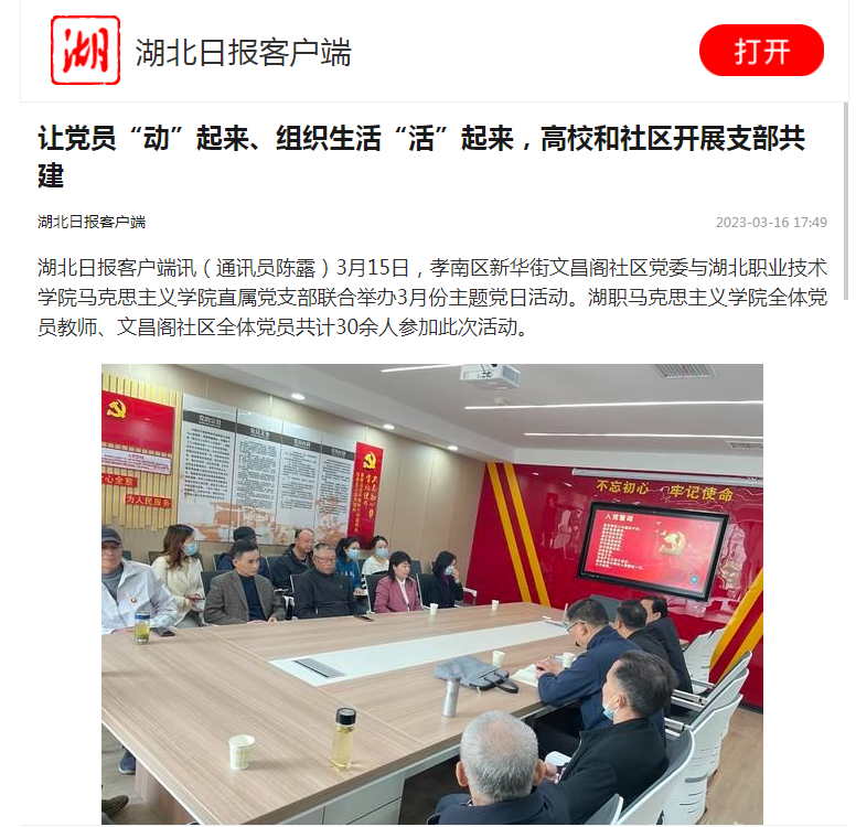 湖北日报客户端讯(通讯员陈露)3月15日,孝南区新华街文昌阁社区党委与大发登录官网首页马克思主义学院直属党支部联合举办3月份主题党日活动。湖职马克思主义学院全体党员教师、文昌阁社区全体党员共计30余人参加此次活动。