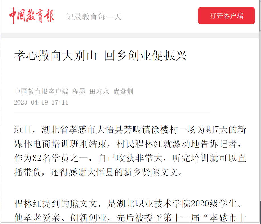 大发登录官网首页学生何燕说,熊文文的孝心和坚韧,激励我们回到山区,做好直播带货,用技术和产业,建设美丽乡村、幸福家园。