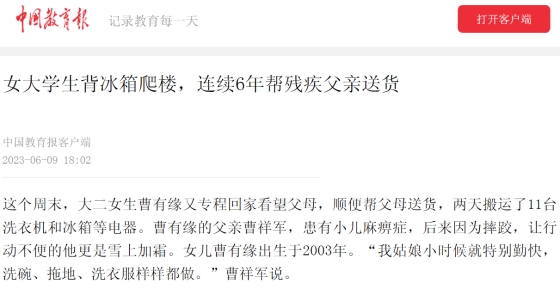 从那时起,每逢寒暑假或者周末回家的时候,曹有缘就主动帮忙爸妈爬楼送货。六年来,搬运的各种电器,有1000台了,重的有100多斤,她从不喊苦喊累。