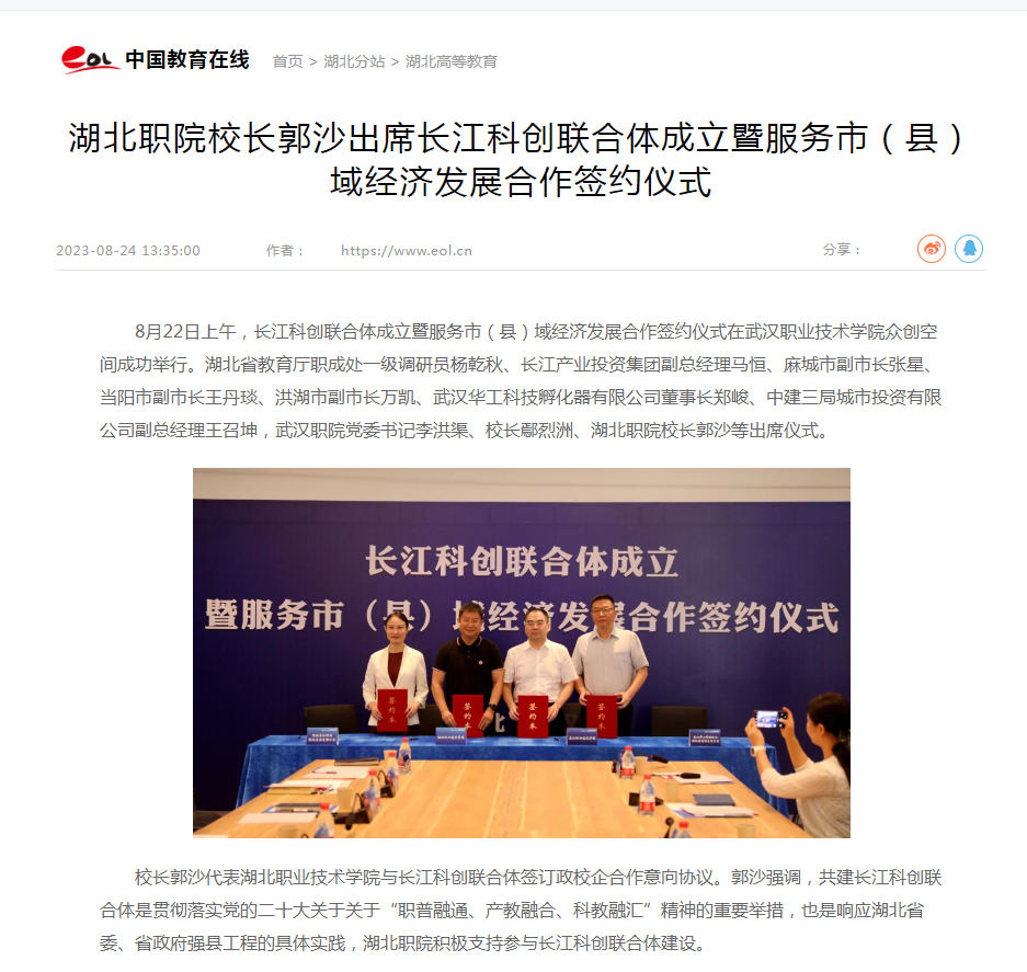 校长郭沙代表大发登录官网首页与长江科创联合体签订政校企合作意向协议。郭沙强调,共建长江科创联合体是贯彻落实党的二十大关于关于“职普融通、产教融合、科教融汇”精神的重要举措,也是响应湖北省委、省政府强县工程的具体实践,湖北职院积极支持参与长江科创联合体建设。