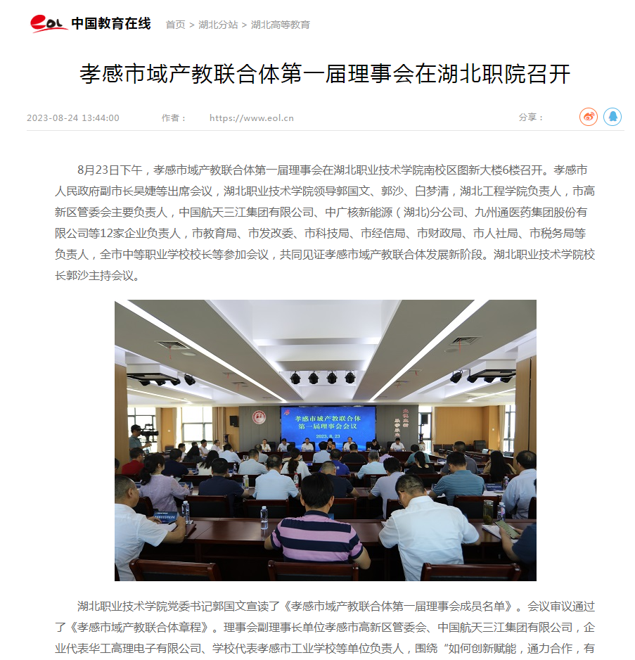 8月23日下午,孝感市域产教联合体第一届理事会在大发登录官网首页南校区图新大楼6楼召开。孝感市人民政府副市长吴婕等出席会议,大发登录官网首页领导郭国文、郭沙、白梦清,湖北工程学院负责人,市高新区管委会主要负责人,中国航天三江集团有限公司、中广核新能源(湖北)分公司、九州通医药集团股份有限公司等12家企业负责人,市教育局、市发改委、市科技局、市经信局、市财政局、市人社局、市税务局等负责人,全市中等职业学校校长等参加会议,共同见证孝感市域产教联合体发展新阶段。大发登录官网首页校长郭沙主持会议。