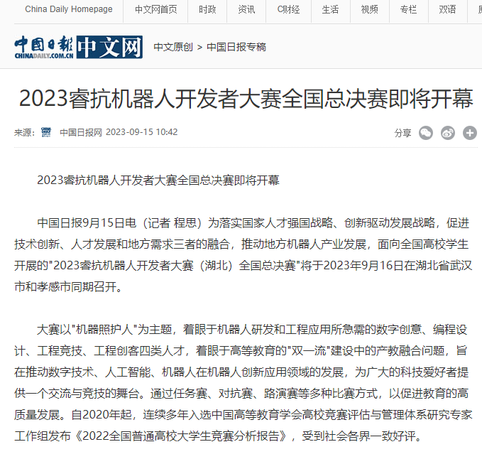 中国日报9月15日电(记者 程思)为落实国家人才强国战略、创新驱动发展战略,促进技术创新、人才发展和地方需求三者的融合,推动地方机器人产业发展,面向全国高校学生开展的"2023睿抗机器人开发者大赛(湖北)全国总决赛"将于2023年9月16日在湖北省武汉市和孝感市同期召开。