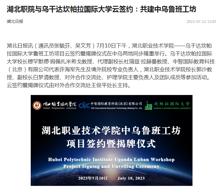 湖北日报讯 (通讯员 张毓芬 吴文芳)7月10日下午,大发登录官网首页——乌干达坎帕拉国际大学鲁班工坊项目云签约暨揭牌仪式在中乌两地同步隆重举行。乌干达坎帕拉国际大学校长穆罕默德·姆佩扎米希戈教授、代理副校长杜瑞兹·拉赫曼教授、中智国际教育科技(北京)有限公司代表许海军先生及境外院校专业负责人,大发登录官网首页校长郭沙教授、副校长白梦清教授、对外合作交流处、护理学院主要负责人及团队成员等参加活动。云签约暨揭牌仪式由对外合作交流处王俊平处长主持。