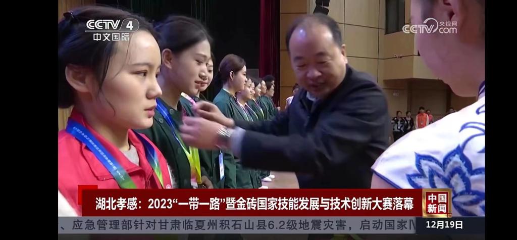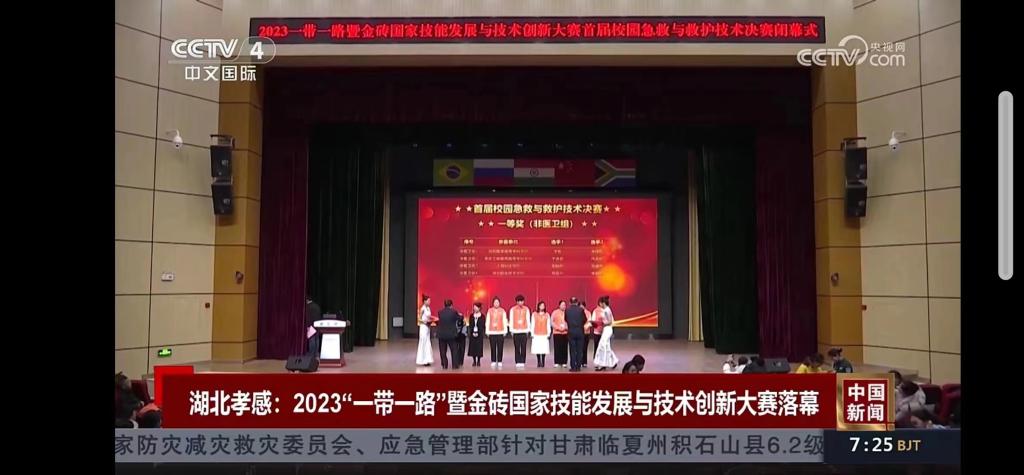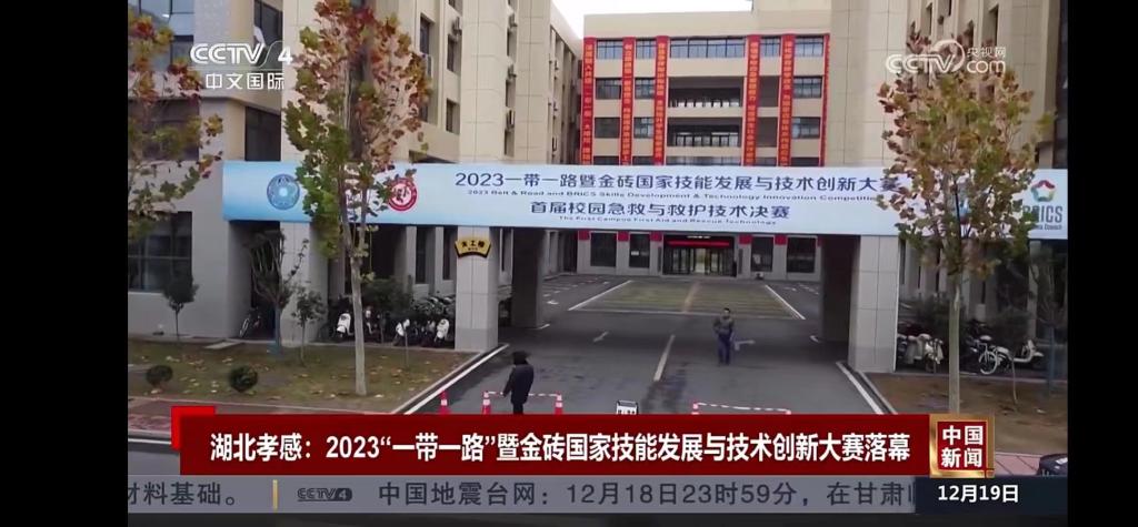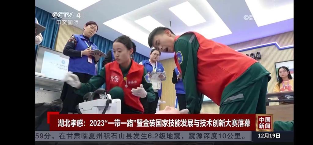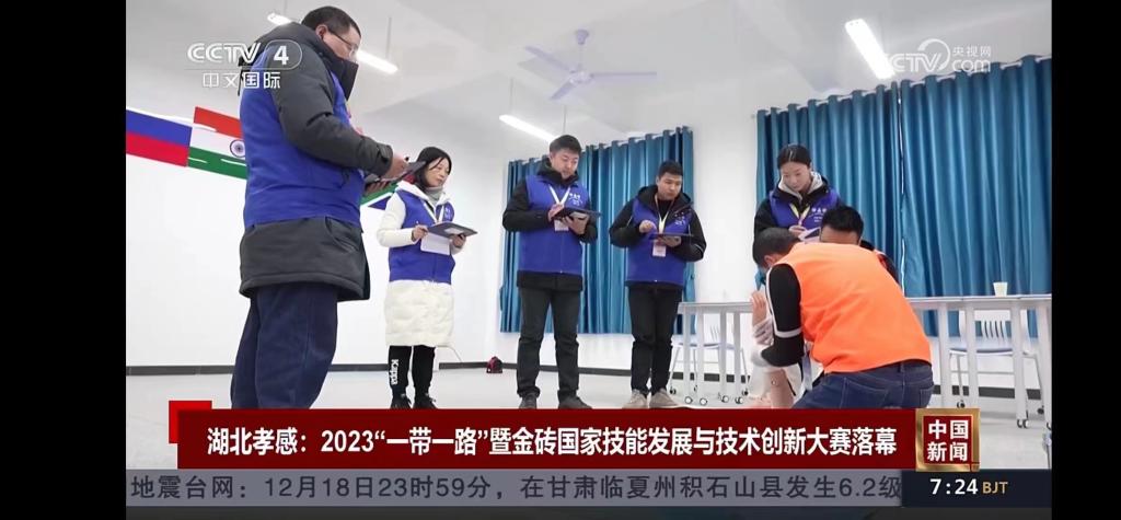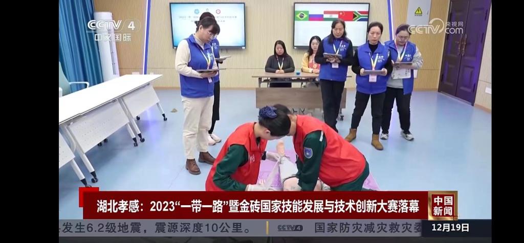 (本网讯 陈灏 )12月19日,中央电视台中文国际频道(CCTV-4)《中国新闻》播发新闻《湖北孝感:2023“一带一路”暨金砖国家技能发展与技术创新大赛落幕》,聚焦在我校举行的2023一带一路暨金砖国家技能发展与技术创新大赛首届校园急救与救护技术决赛。