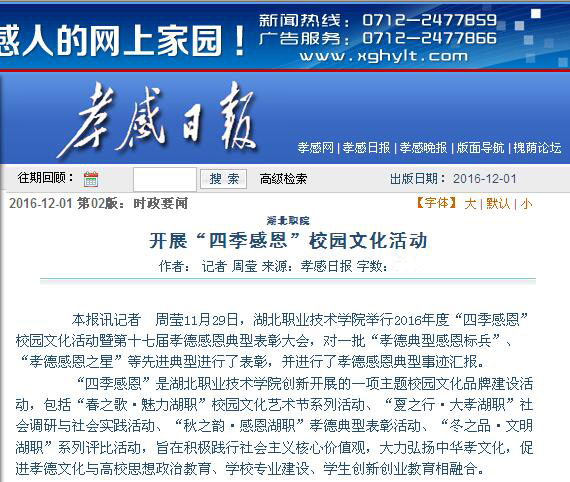 “四季感恩”是大发登录官网首页创新开展的一项主题校园文化品牌建设活动,包括“春之歌·魅力湖职”校园文化艺术节系列活动、“夏之行·大孝湖职”社会调研与社会实践活动、“秋之韵·感恩湖职”孝德典型表彰活动、“冬之品·文明湖职”系列评比活动,旨在积极践行社会主义核心价值观,大力弘扬中华孝文化,促进孝德文化与高校思想政治教育、学校专业建设、学生创新创业教育相融合。