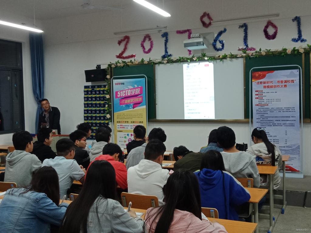 4月25日晚,北京超星公司一行4人来到信息技术学院教室,为2017级学生全面介绍了“51CTO学院”,随后向同学们介绍了移动图书馆,以及最新的学习平台――“云舟学习通”,并通过手机操作演示了“云舟学习通”的功能,以及如何通过“云舟学习通”平台进行学习。同时还介绍了超星公司在全国的发展情况,以及在武汉的研发基地,并邀请同学们参观学习。