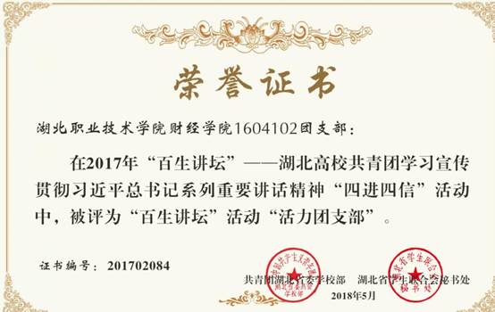日前,财经学院收到共青团湖北省委学校部、湖北省学联秘书处联合对2017年湖北高校共青团学习宣传习近平总书记系列重要讲话精神“四进四信”活动中的先进基层团组织进行了表彰,我校财经学院201604102班团支部在“百生讲坛”活动中被评委“活力团支部”。