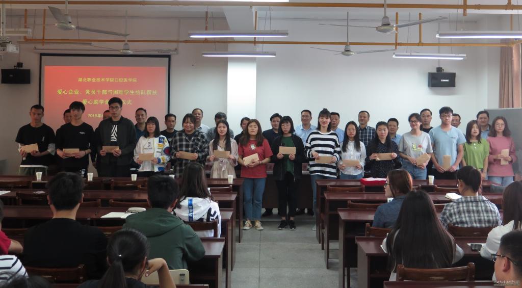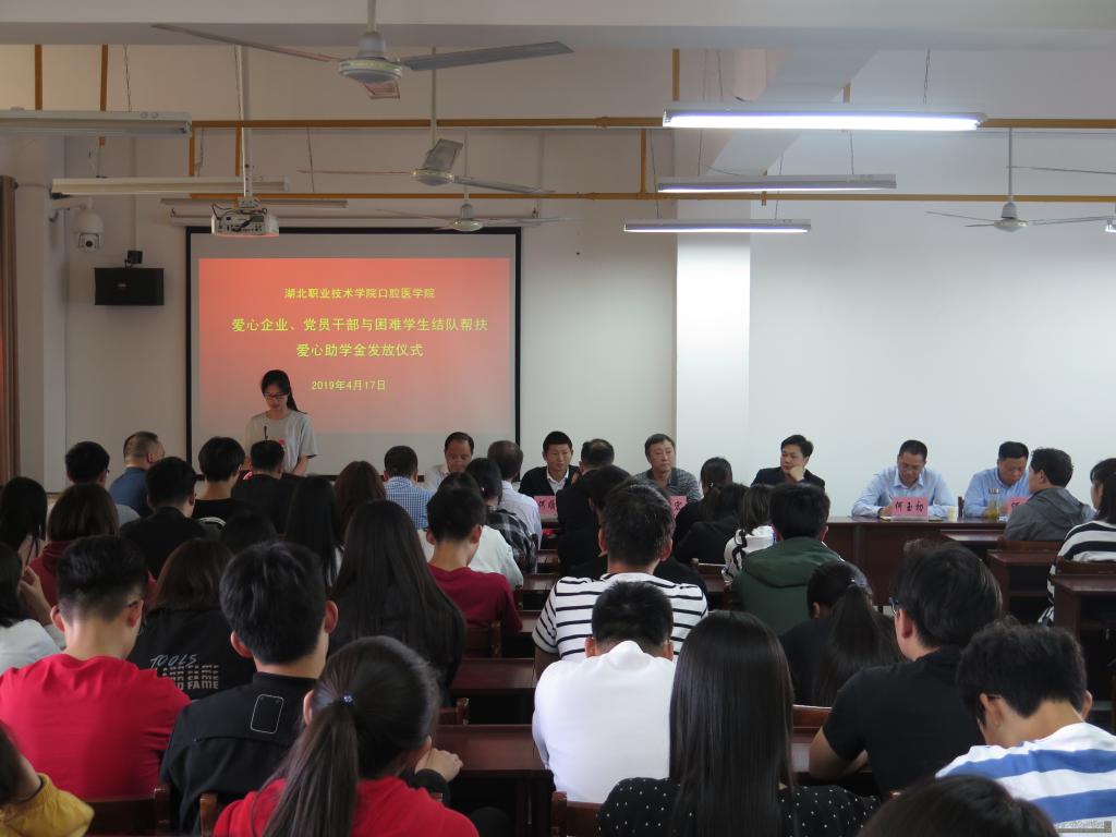 仪式上,出席活动的嘉宾向15名贫困学子每人发放了1000元爱心助学金。口腔医学院负责人廖建宏向爱心企业代表颁发了“爱心团体”牌和“爱心人士”证书。受助学生代表——2018级口腔医学专业学生孙倩,深情地表达了奋发图强、回报社会的决心;“爱心企业”代表孝感市口腔医学会民营口腔专委会会长涂艮斌表示,今后将继续创造条件资助更多的贫困学生,为社会公益事业多做贡献。党委宣传部、学工部相关负责人分别发言,对爱心企业表示衷心的感谢,希望困难学子要把困难当成励志的磨练,放下思想包袱,树立远大的理想,努力学好专业知识,以实际行动回报国家和社会。