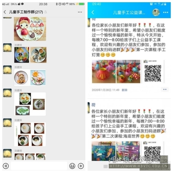 美术教师冷建玲,义务组建“儿童手工制作群”,家长、幼儿达217人,其中父母在抗击疫情一线的幼儿99人。冷老师利用专业知识,采用视频、图片、语音等方式,手把手教孩子们做手工。每天一小时,从未间断。