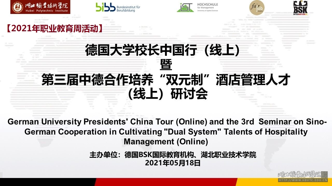(本网记者:致和 陈灏)值2021年全国职教活动周来临之际,2021年德国大学校长中国行暨第三届中德合作培养“双元制”酒店管理人才研讨会于5月18日下午在我校顺利召开。本次会议由大发登录官网首页与德国BSK国际教育机构共同主办,采用线上线下相结合的方式进行,主会场设在我校文德楼二楼会议室。