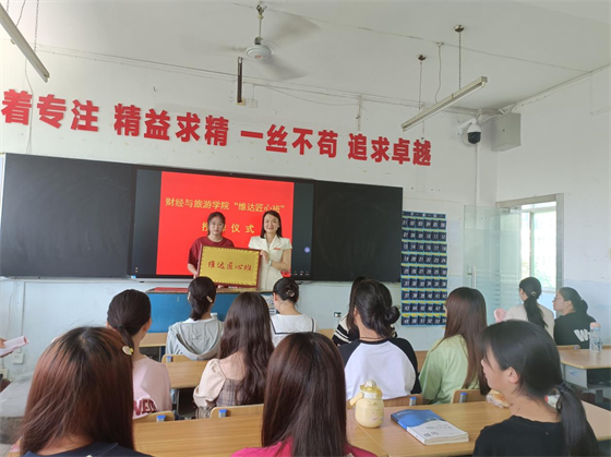 6月20日上午,财经与旅游学院在文华楼院22040102班举行“维达匠心班”授牌仪式。全国“五一”劳动奖章获得者杨晶、院党总支书记罗安文、副院长陈卫红、教学办主任刘爱华、辅导员黄曙光及全班同学参加了授牌仪式,会议由罗安文书记主持。