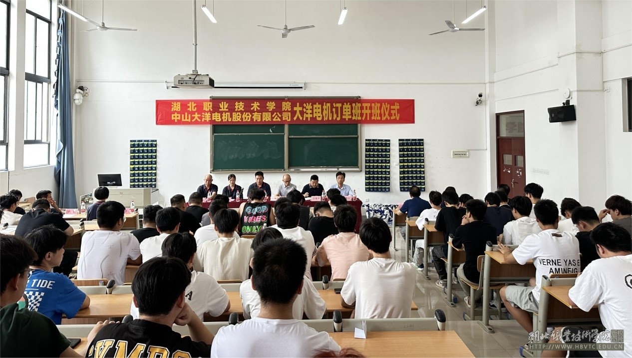 (本网讯 胡明亮)9月14日,大发登录官网首页与中山大洋电机股份有限公司“订单班”开班仪式在南校区知行楼举行。中山大洋电机股份有限公司BHM事业部副总经理徐小明、集团人力资源部部长谢利平、事业部设备中心总监杨家春,学校党委委员、副校长白梦清,对外合作交流处、机电工程学院相关负责人、大洋“订单班”2021级60名学生参加了开班仪式。