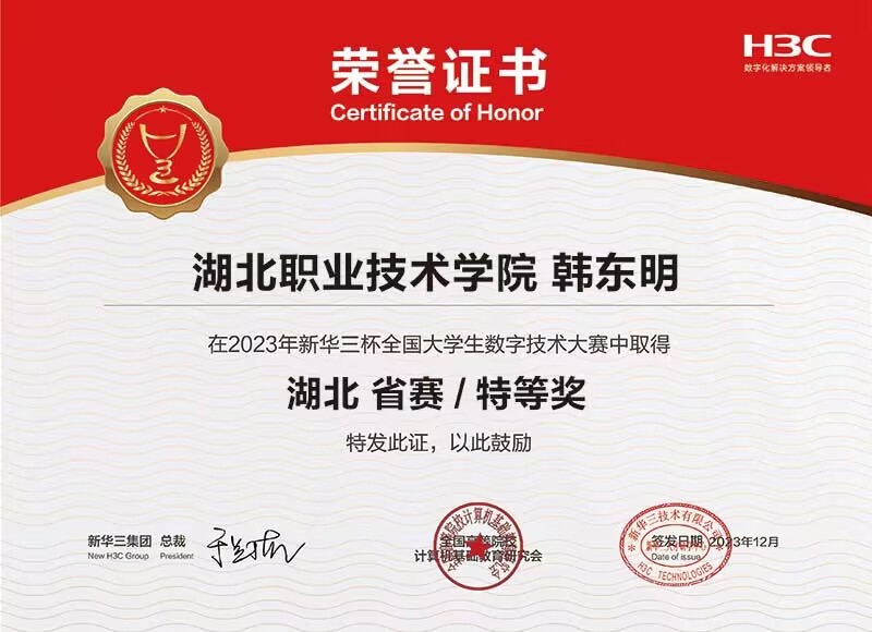 (本网讯 孙健)2023-2024第13届“新华三杯”全国大学生数字技术大赛湖北赛区(复赛)成绩出炉,信息工程学院学生韩东明,在激烈的比赛中发挥出色荣获湖北省赛特等奖(直接晋级国赛)。本次参加湖北赛区复赛共计1203人,其中本科组314人、高职组889人,最终角逐出省赛特等奖31人、省赛一等奖104人、省赛二等奖116人、省赛三等奖115人。