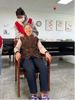 董奶奶幽默风趣感谢志愿者:“孩子们,谢谢你们给我捶捶打打,太舒服了!希望你们常来啊!”老奶奶拉着志愿者的手,依依不舍。志愿者给老人讲笑话、拉家常,陪伴爷爷奶奶们度过一个温暖的下午。