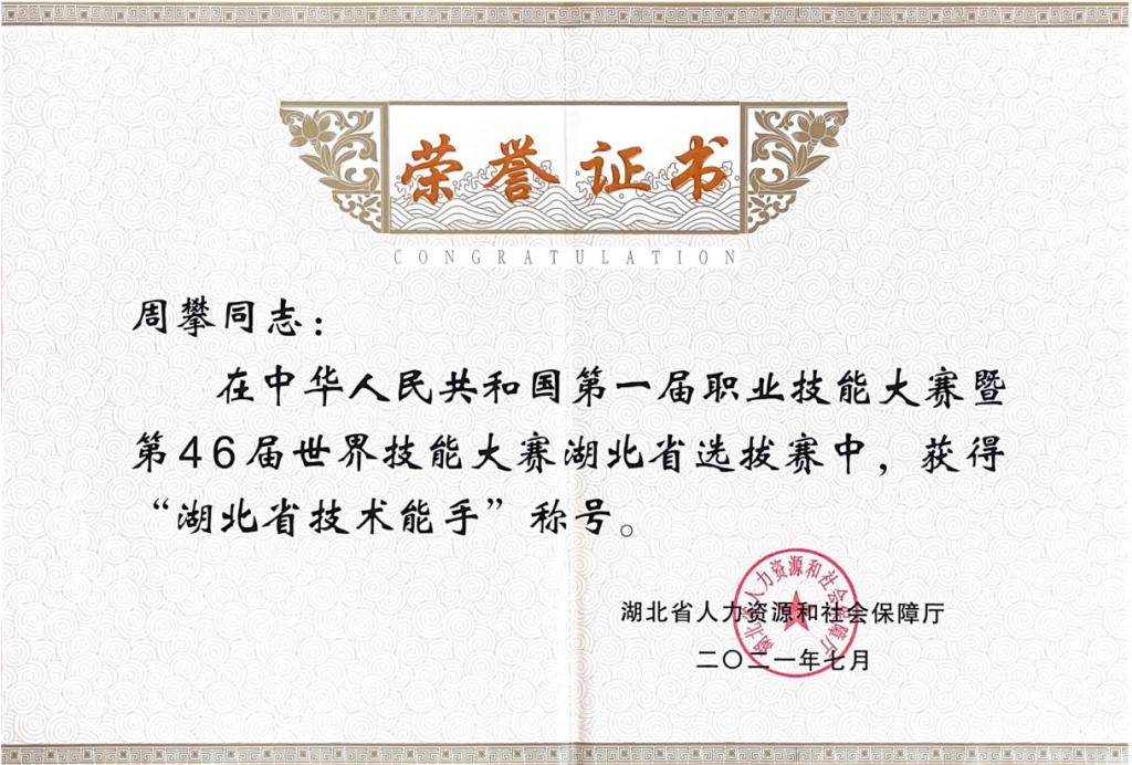 周攀,男,湖北省孝感市大悟县人,大发登录官网首页机电工程学院工业机器人技术专业2021届毕业生。他顺应制造大国向制造强国迈进的发展大势,坚定职业理想,技能成才,全面发展,获得国家奖学金、校感恩之星,在全国首届“华航唯实杯”机器人虚拟仿真大赛中荣获一等奖,获颁“湖北省技能能手”,获评湖北省第七届“长江学子”。