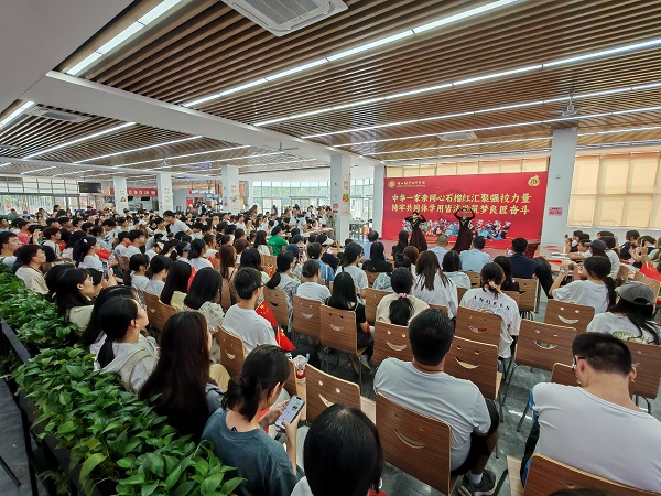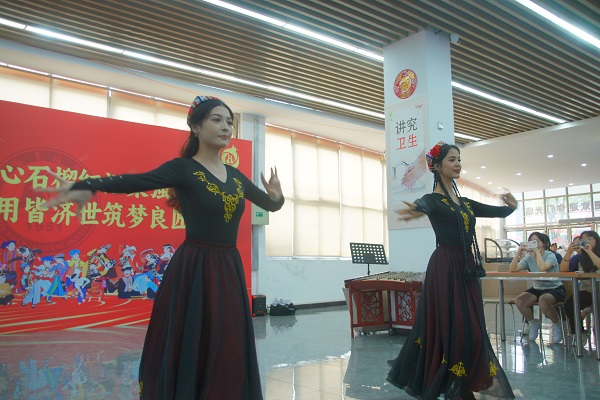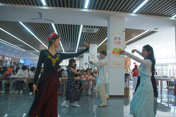 东苑食堂座无虚席,温馨和谐,石榴红映照中国红,“连心曲”共鸣“凝心曲”,各族师生代表、来自边疆地区的食堂务工员工济济一堂,倾情分享、以诗言志、挥毫泼墨、制作糕点、载歌载舞,讲述各民族丰富多彩的传统文化、风俗习惯,开展形式多样、内涵丰富的民族团结“开学第一课”,展示师生铸牢中华民族共同体意识、感恩奋进强校征程、共建共享中华民族共有精神家园的底色和亮色。