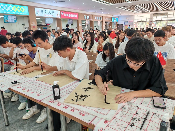 人月两团圆,美好永同在。许飞、熊梓皓同学的诗歌朗诵《中秋》,深情并茂,将中秋佳节的思念与团圆之情娓娓道来,让在场的每一个人都能感受到那份跨越时空的温情与祝福。石榴同心,诗画同源,在现场泼墨挥毫的同学们,纷纷写下对伟大祖国的祝福和民族团结的期盼,老师们选定后,将“墨宝”赠给各族同学和“民族团结进步示范寝室”,共建中华民族共有精神家园。