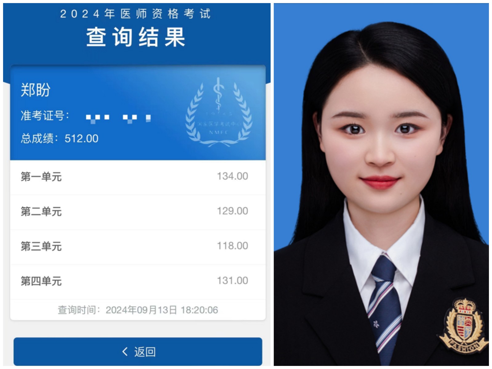 (本网讯 苏莹)近日,2024年全国执业医师资格考试成绩出炉,我校口腔医学院2021届毕业生郑盼取得总分512分的好成绩,为全省最高分,在全国59万考生中位列前茅(全国最高分为516分)。