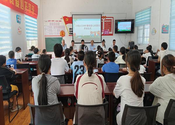 (本网讯 彭裕刚 邓彬新 刘冠儒 )7月7日,孝昌县小悟乡万冲村党员群众服务中心彩旗飘扬、笑语盈盈,我校医学院、口腔医学院携手孝昌县团委、小悟乡党委政府、万冲村村委会共同举办的暑期“爱心托管”开班仪式举行。医学院党总支书记高想清、口腔医学院党总支书记周建平,共青团孝昌县委书记宁莎莉,小悟乡党委书记徐宝传,党委副书记、乡长蔡浩泽出席开班仪式。湖北职院驻孝昌县小悟乡万冲村第一书记高俊强、医学院副院长王光耀、口腔医学院副院长张玮、医学院团委书记邓彬新、党政办相关人员、志愿者等参加活动。开班仪式由高俊强主持。