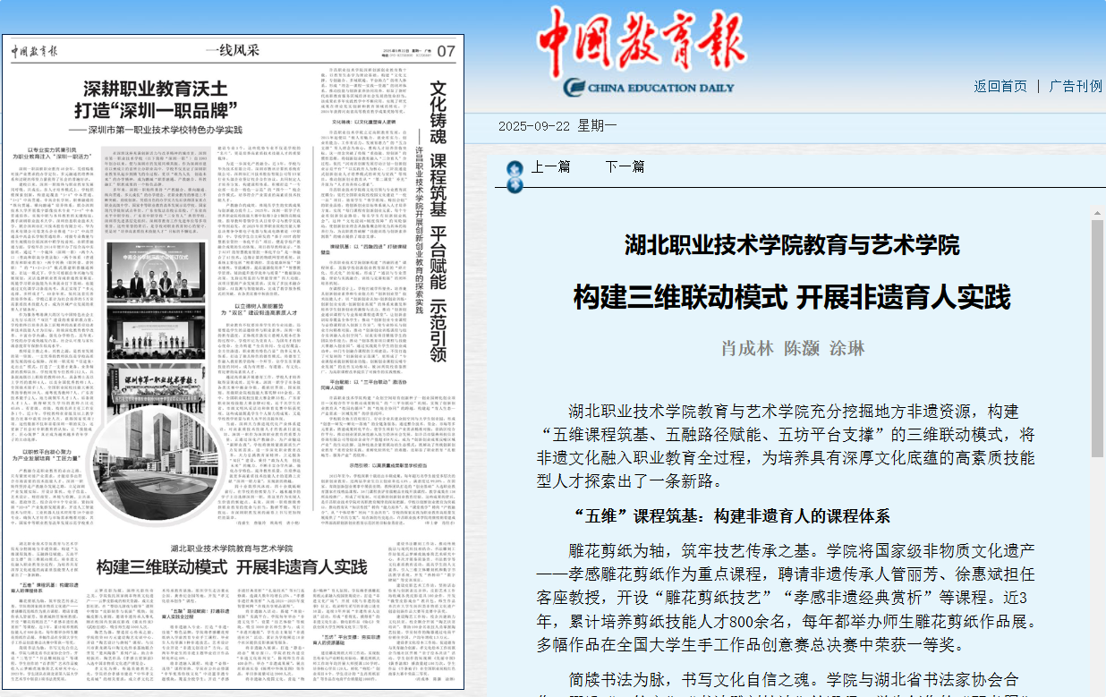 大发登录官网首页教育与艺术学院充分挖掘地方非遗资源,构建“五维课程筑基、五融路径赋能、五坊平台支撑”的三维联动模式,将非遗文化融入职业教育全过程,为培养具有深厚文化底蕴的高素质技能型人才探索出了一条新路。