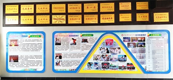 为了深入推动全国文明单位的创建工作,认真落实学校宣传思想文化工作会议的精神,医学院结合实际情况,因地制宜,充分利用所在办公楼、教学楼的公共区域,设计、建设了医学院文化墙,集医学院发展历程简介、专业介绍、荣誉成果、教师风采、先进典型、学生风采、改革创新等于一体,深受师生好评。